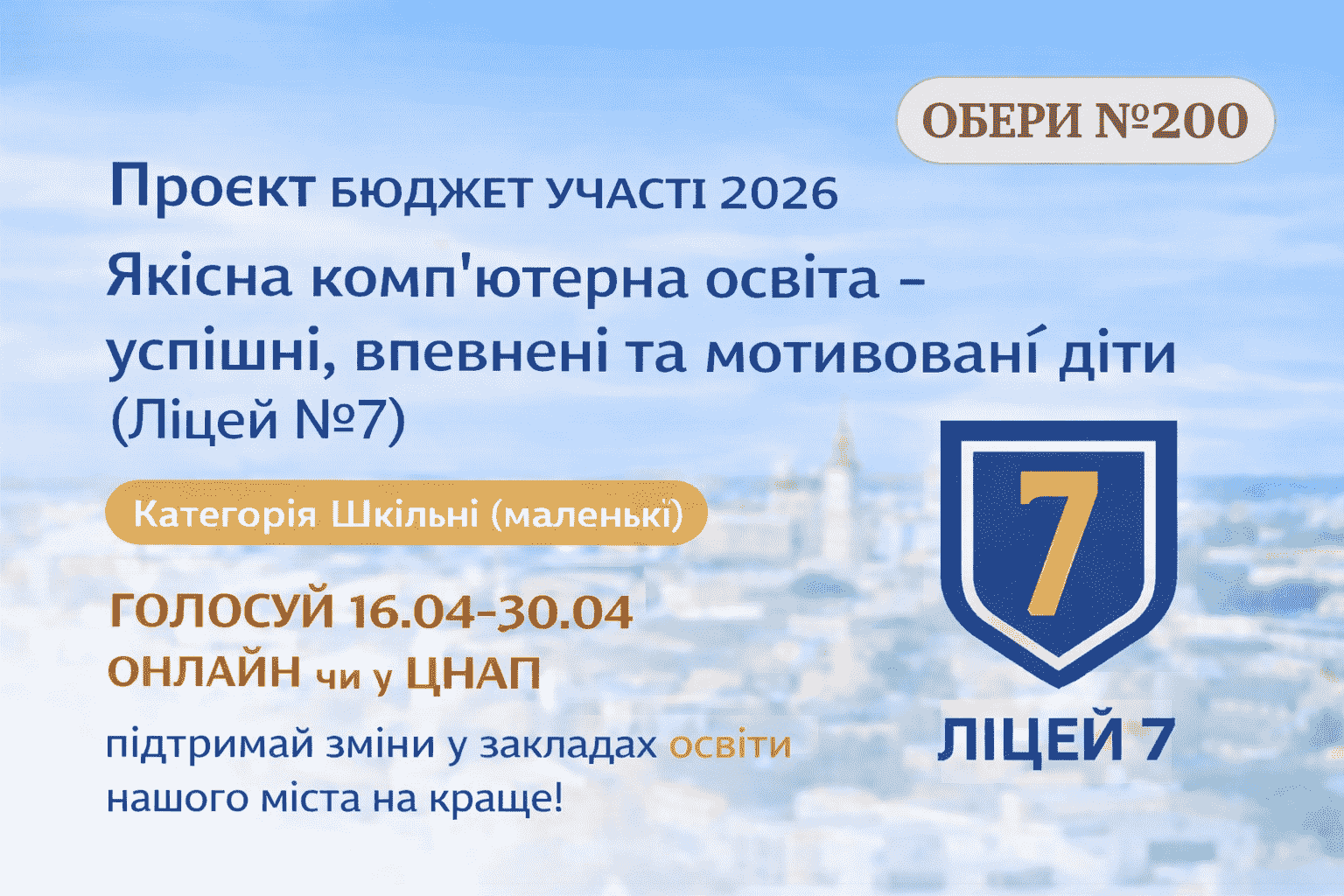 Щиро просимо підтримати наш заклад та проголосувати за проєкт №200 «Якісна комп'ютерна освіта — успішні, впевнені та мотивовані діти (Ліцей №7)».