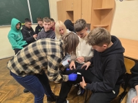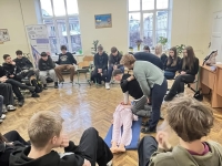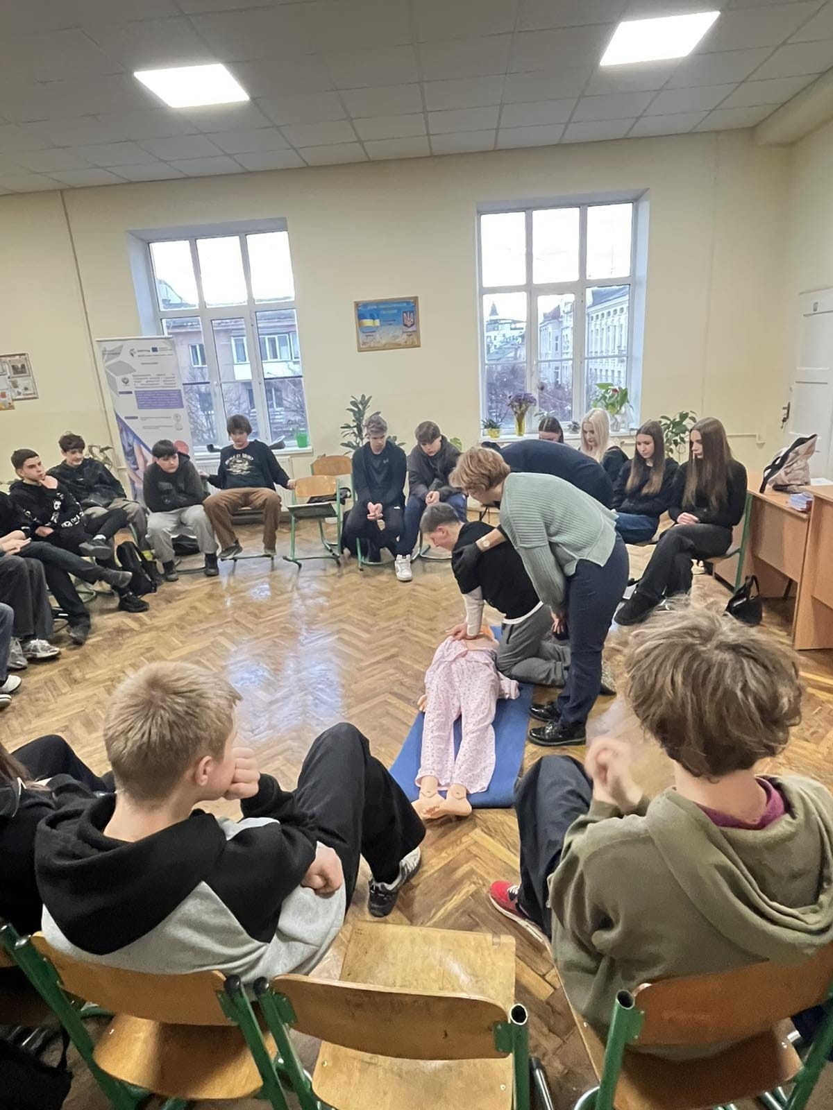 Для учнів 10-го класу заняття провела директор ліцею — Оксана Румак, разом із медиком, який допомагав у демонстрації та практичній частині. Вони професійно та доступно пояснили алгоритм дій у надзвичайних ситуаціях, продемонстрували техніки порятунку на манекені та навчили правильно використовувати турнікет. Учні мали можливість відпрацювати серцево-легеневу реанімацію, перевірку дихання та інші життєво важливі навички.