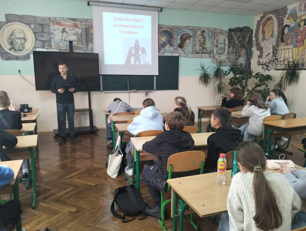 Під час зустрічі учні разом із педагогом розмірковували, як слова можуть впливати на стосунки між людьми, як конфліктні вислови перетворити на доброзичливі, та чому важливо говорити «мовою поваги».
