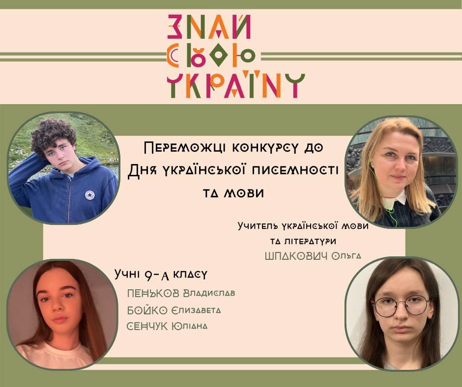 Учні 9-А класу — БОЙКО Єлизавета, СЕНЧУК Юліана та ПЕНЬКОВ Владислав — стали переможцями конкурсу до Дня української писемності та мови від освітнього проєкту “Знай свою Україну”.Змагання проходило в межах блоку «Покрова», де учні представили творчу відеороботу на тему «Якби я був помічником Покрови, кого б оберігав — і чому?»