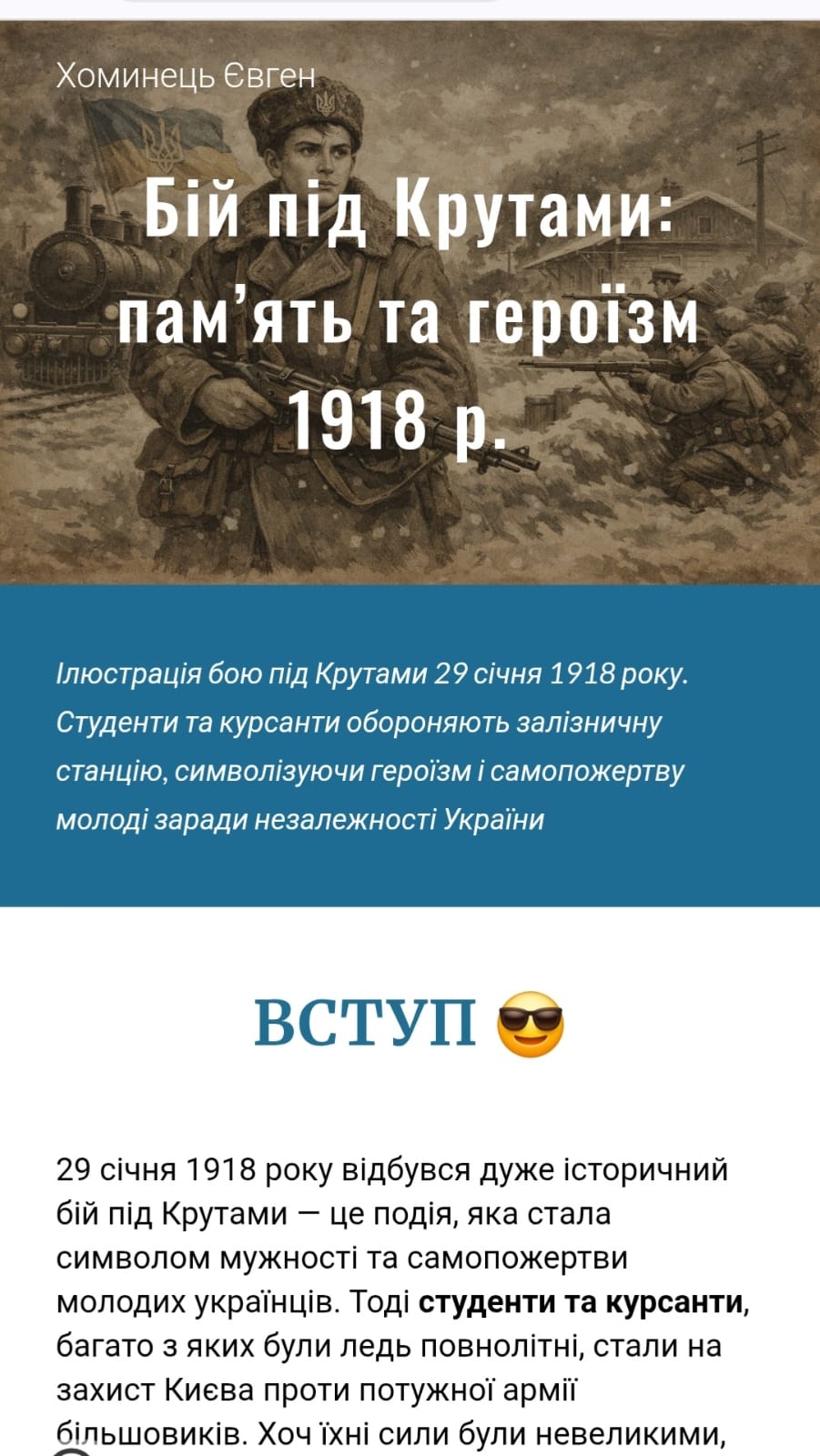 Учень 10-А класу (кл. керівник - Іванна Луканюк) Хоминець Євген підготував QR-коди зі змістовною та пізнавальною інформацією про подвиг українських студентів і гімназистів, щоб кожен охочий міг дізнатися більше про цю важливу сторінку нашої історії.