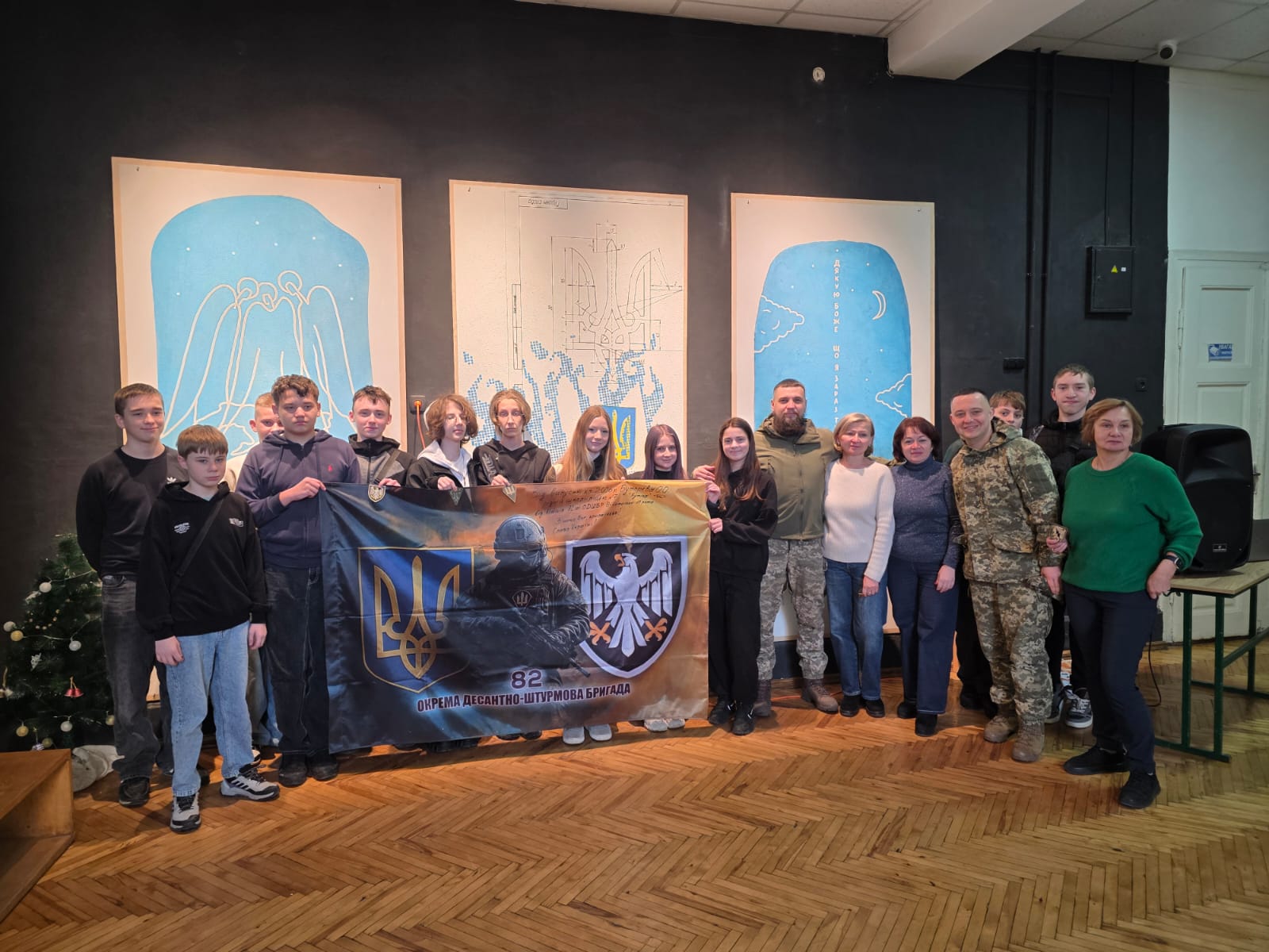 На знак вдячності військові подарували ліцею прапор 82-ї окремої десантно-штурмової бригади – як символ довіри, єдності та спільної боротьби за Україну.