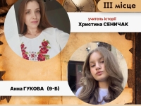 Анна ГУКОВА (9-Б клас) посіла ІІІ місце в проєкті “Історія міст і сіл України” з роботою “Іра Маланюк — оперна прима зі Станіславова”.